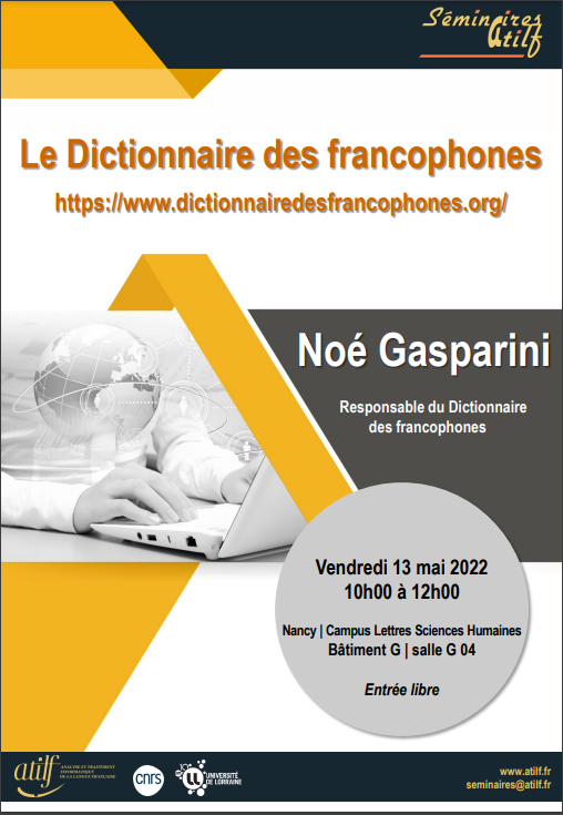 Noé Gasparini, chef de projet du dictionnaire des francophones, de l'Institut International pour la Francophonie (rattaché à l'Université de Lyon) vient présenter le Dictionnaire des francophones et également fixer les contours d'un partenariat plus étroit avec l'ATILF.